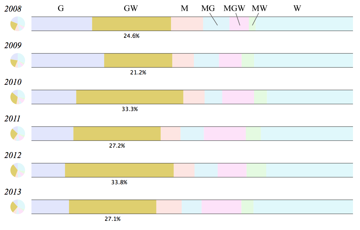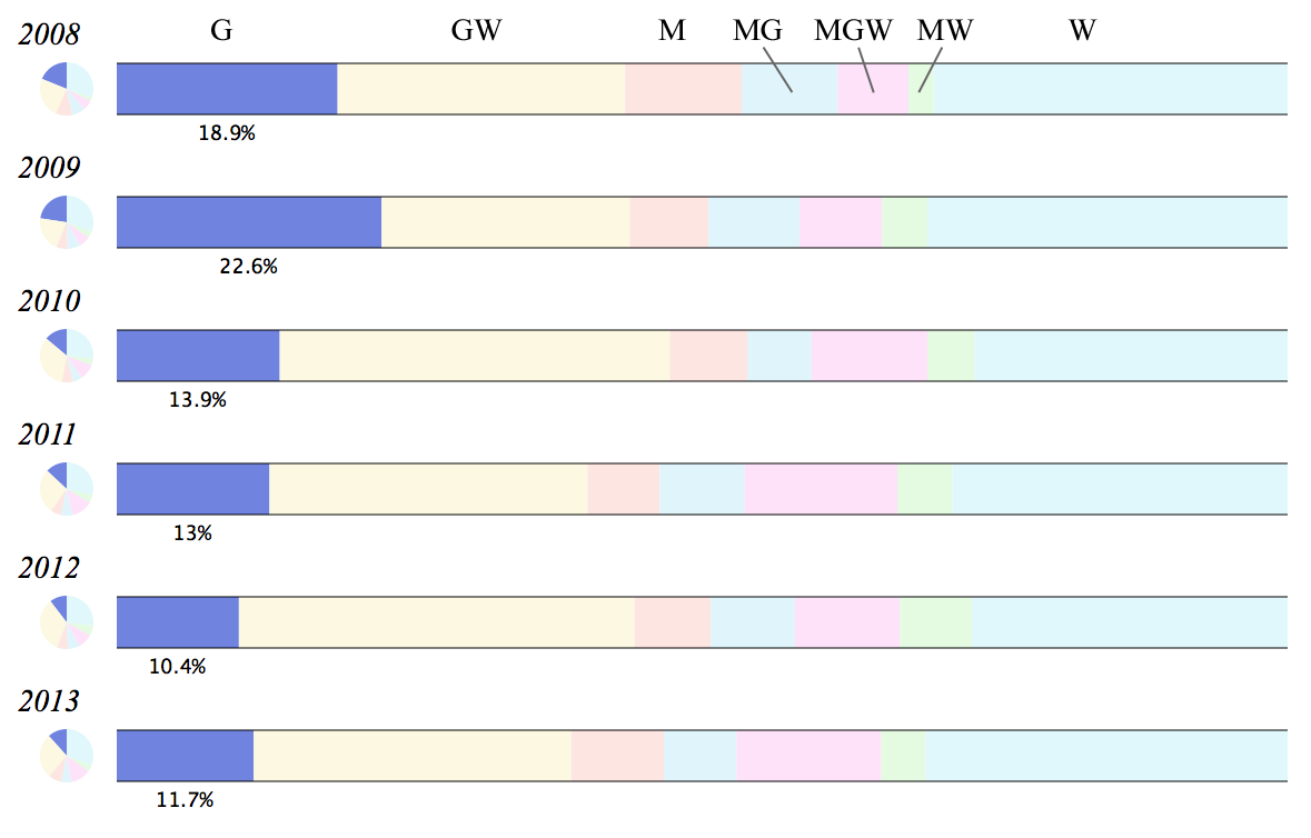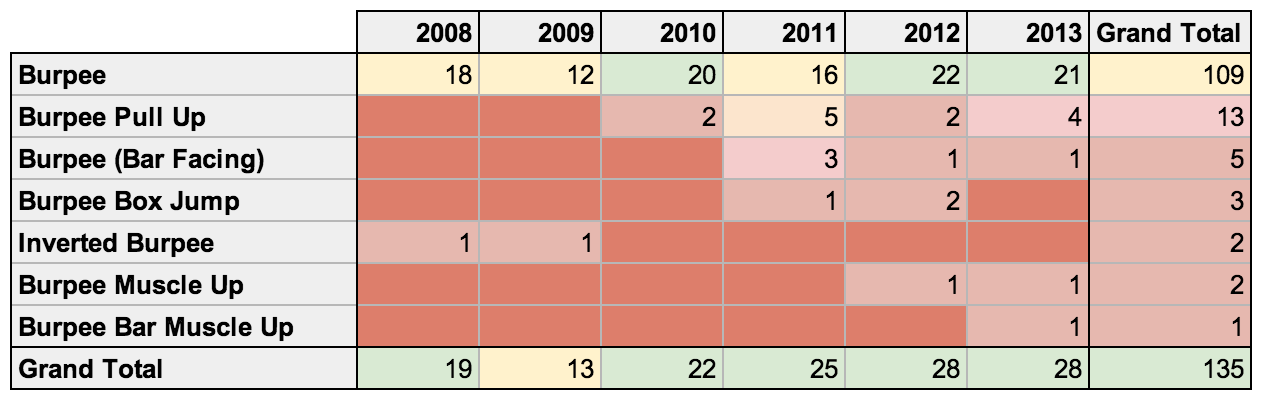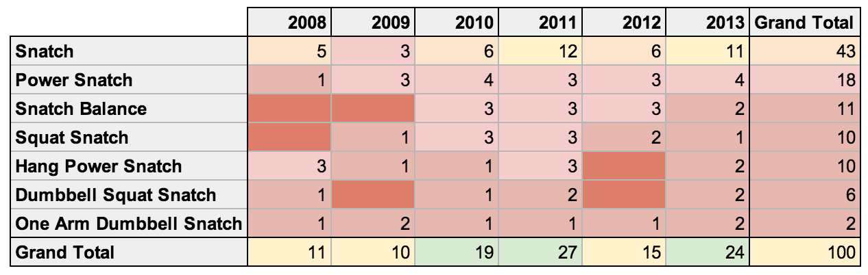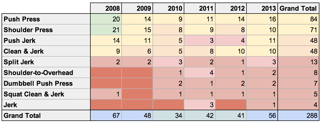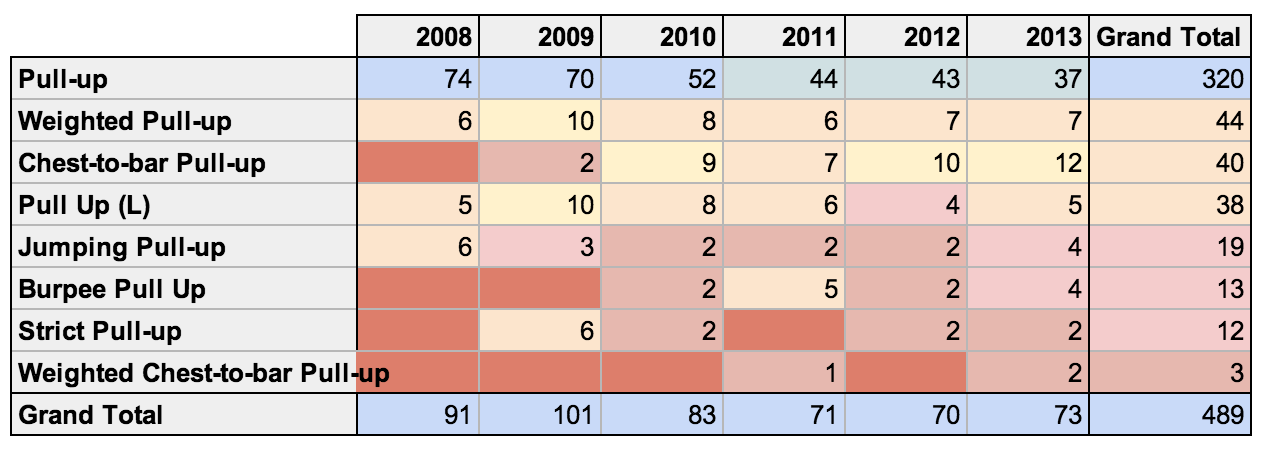 Standard Pull-ups have seen a very consistent decline over this period, from a high of 74 times in 2008 to a low of 37 times in 2013. Rings Dips have also fallen out of favor over this period.