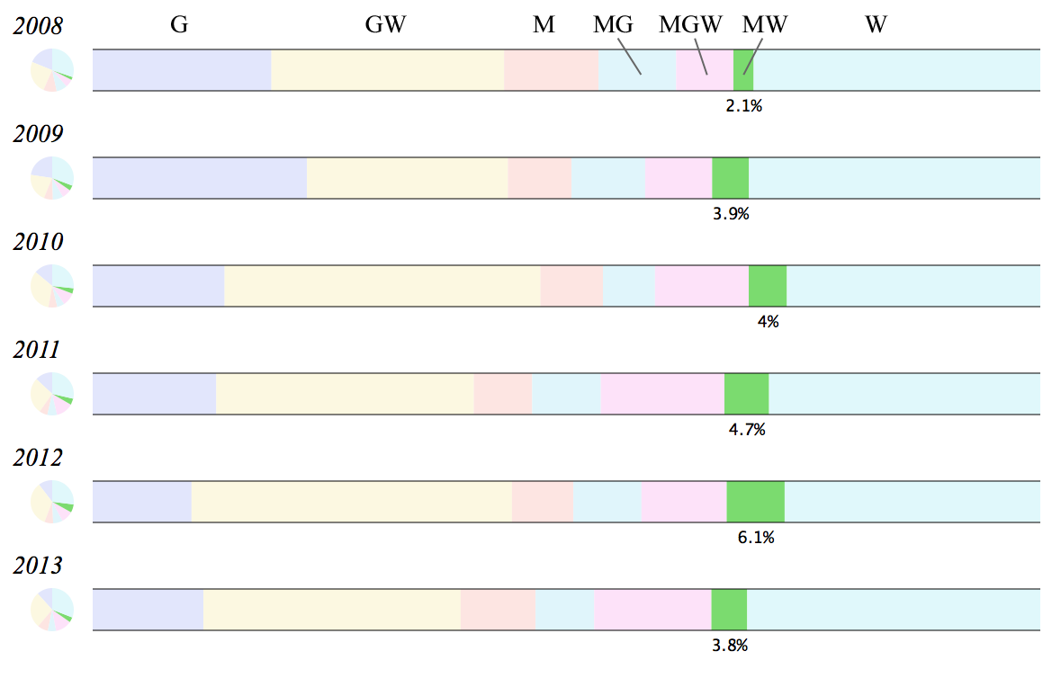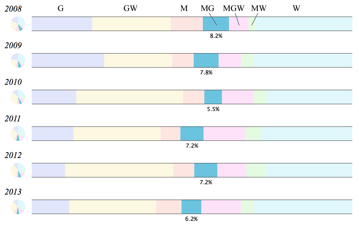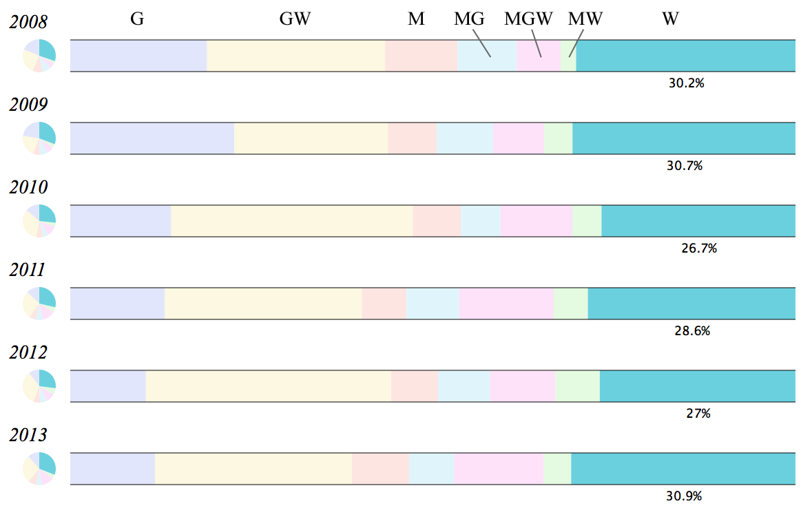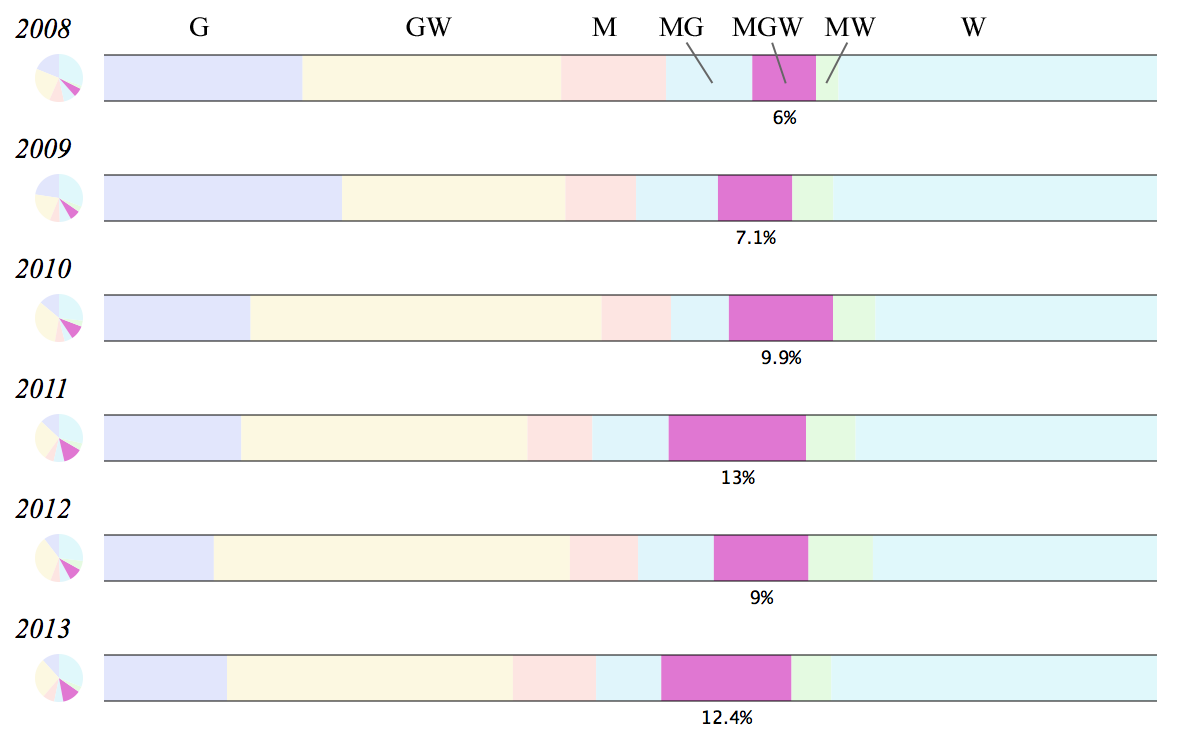 Standard Pull-ups have seen a very consistent decline over this period, from a high of 74 times in 2008 to a low of 37 times in 2013. Rings Dips have also fallen out of favor over this period.