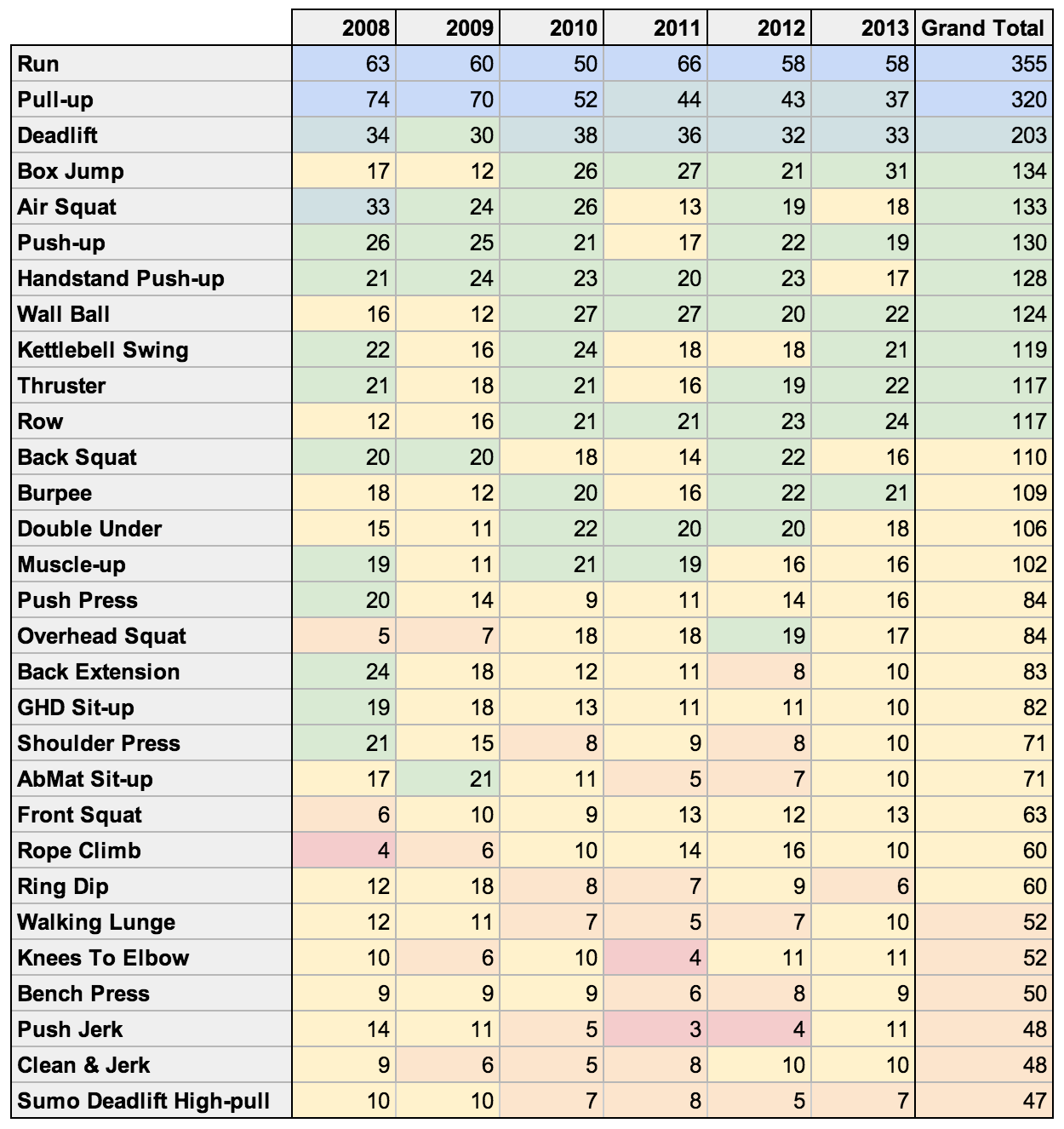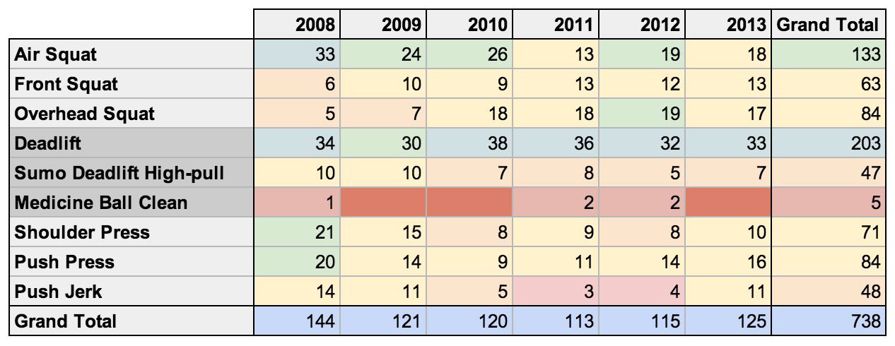 It’s interesting to look at the most commonly assigned movements on CrossFit.com (2008-2013). It can give us a very real sense of which movements are seen as paramount to the programmers at CrossFit HQ. Looking at the ebb and flow of particular movement frequencies can give us insight into their evolving ideas of what the most important/effective movements are.