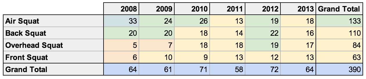 We can see a drop-off in the Air Squat over the years, accompanied by an increase in Front Squat and Overhead Squat Frequency.