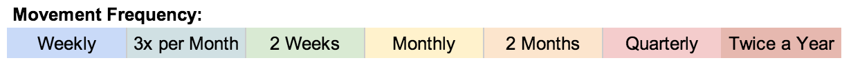 The top 10 movements are consistently assigned twice monthly or more.