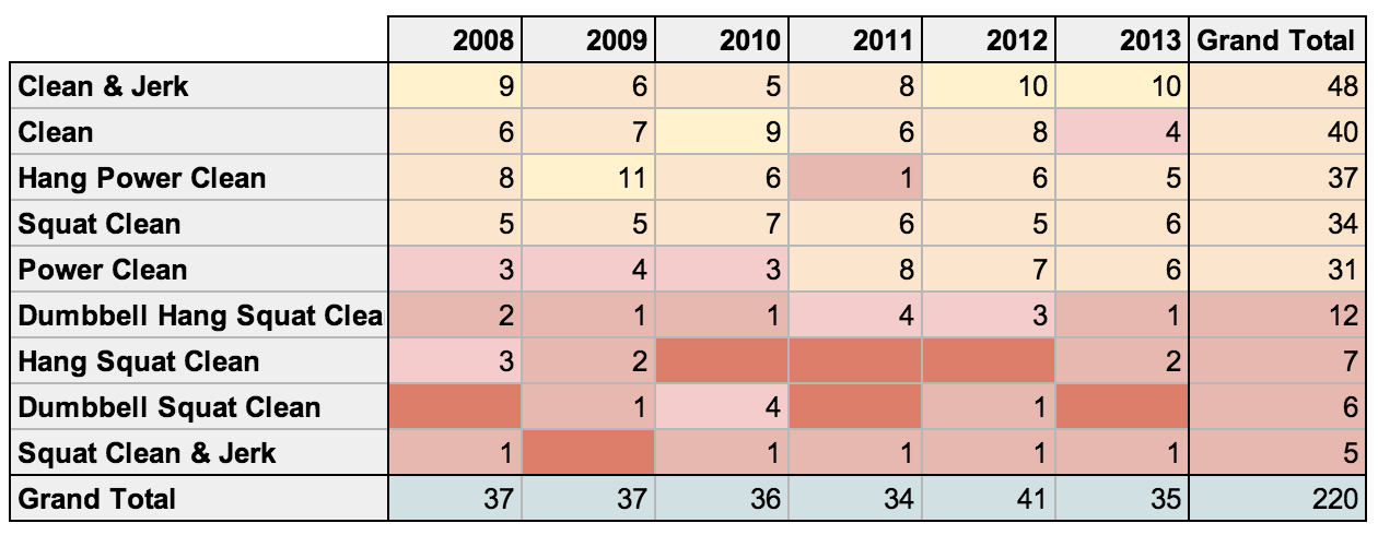 This analysis uncovered quite a few unexpected trends for me, personally. I was very surprised to see that Pull-ups have decreased by about half since 2008. I was also surprised to see the prominence of the Deadlift, and I originally was expecting to find a lot more Snatches assigned. I hope you found some useful insights above.